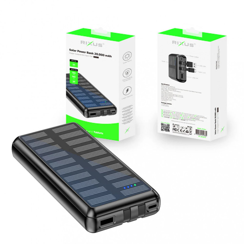 Power Bank 20000 mAh | 22.5W —Rixus RXPB47 Solar With Built-in Cables